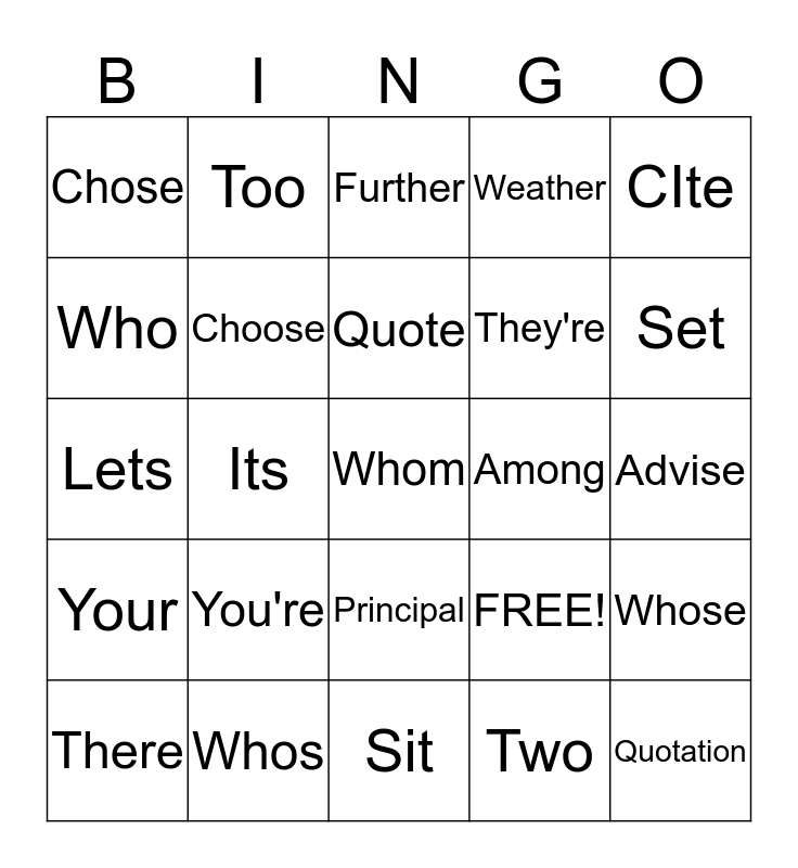 This bingo card has 25 words: You're, Sit, Quote, There, CIte, Chose, Who, Too, Among, Principal, They're, Lets, FREE!, Whose, Choose, Quotation, Advise, Further, Set, Its, Whom, Whos, Your, Weather and Two.