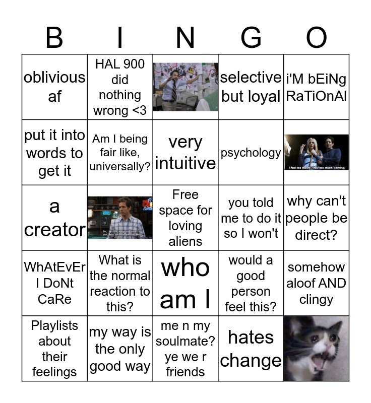 This bingo card has 4 images, a free space and 20 words: What is the normal reaction to this?, my way is the only good way, very intuitive, Playlists about their feelings, i'M bEiNg RaTiOnAl, oblivious af, put it into words to get it, HAL 900 did nothing wrong <3, you told me to do it so I won't, who am I, psychology, a creator, would a good person feel this?, somehow aloof AND clingy, Am I being fair like, universally?, hates change, why can't people be direct?, WhAtEvEr I DoNt CaRe, selective but loyal and me n my soulmate?ye we r friends.