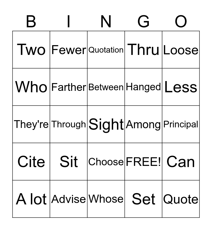 This bingo card has 25 words: Sit, Whose, Between, A lot, Loose, Two, Who, Fewer, Among, Choose, Hanged, They're, FREE!, Can, Farther, Quote, Principal, Quotation, Less, Through, Sight, Advise, Cite, Thru and Set.