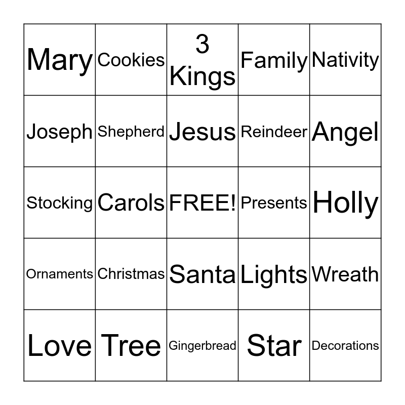 This bingo card has a free space and 24 words: Christmas, Tree, Jesus, Love, Nativity, Mary, Joseph, Cookies, Presents, Santa, Reindeer, Stocking, Lights, Wreath, Shepherd, Star, Holly, 3 Kings, Angel, Carols, Decorations, Ornaments, Family and Gingerbread.