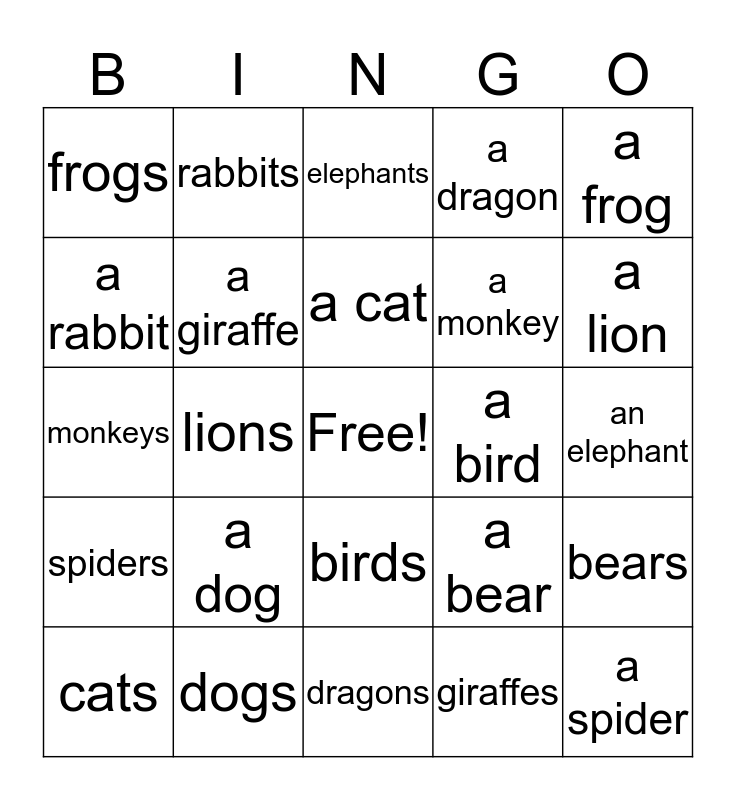 This bingo card has a free space and 24 words: a dog, dogs, a cat, cats, a frog, frogs, a rabbit, rabbits, a bird, birds, a monkey, monkeys, a bear, bears, a giraffe, giraffes, an elephant, elephants, a lion, lions, a spider, spiders, a dragon and dragons.