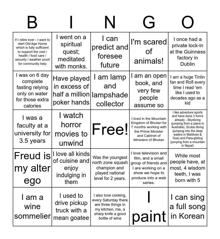 This bingo card has a free space and 39 words: I'm a secret shopperholic, I am an aspirational guitarist, I'm a trained flutist, I am an open book, and very few people assume so, I can sing a full song in Korean, Freud is my alter ego, Have played in excess of half a million poker hands, This person really likes Dogs., I'm scared of animals!, I like adventure sports and have done 3 forms already - Skydiving (jumping from a plane in Australia), Scuba diving (jumping into the deep waters in Maldives & Goa) and Para-gliding (jumping from a mountain in Nepal), I was on 6 day complete fasting relying only on water for those extra calories, I went on a spiritual quest; meditated with monks., I run a farm that does Goat Yoga, I love television and film, and a small group of friends and I are working on a show we hope to produce into a web series., I am a huge Tintin fan and Rofl every time I read 'em like I used to decades ago as a kid, I was a faculty at a university for 3.5 years, I am on a low carb lifestyle which helped me lose 18 kgs over the past 15 months, I can predict and foresee future, I love indie rock music, and see about twenty-five different new live band performances each year. I'd love seeing very young, upcoming bands that are just getting their career in music started., While most people have, at most, 4 wisdom teeth, I was born with 5, If I retire ever - I want to start Old Age Home which is fully sufficient to support the cost / health / food care / security / weather proof for community help, I love all kinds of cuisine and enjoy indulging in them, I also love cooking, every Saturday there are three things in my kitchen, me, a sharp knife a good bottle of wine, I lived in the Mountain Kingdom of Bhutan for 7 months working with the Prime Minister and Cabinet of Ministers of Bhutan, I acted in a movie and it has an IMDB entry., I am a wine sommelier, I used to drive pickup truck with a mean goatee, I have a man crush on Pierce Brosnan, I did skydiving from 15k feet., I once had a private lock-in at the Guinness factory in Dublin, I built a cedar strip canoe, I am a kickboxing champ!, I am lamp and lampshade collector, I paint, I cook great Biryani!, Had a full mullet in high school, I watch horror movies to unwind, Was the youngest north zone squash champion and played national level for 2 years. and I really, sometimes work. People do not believe it, but ;).