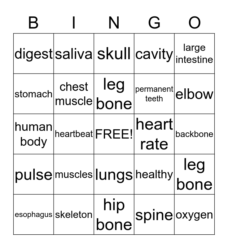 This bingo card has a free space and 24 words: muscles, skeleton, leg bone, esophagus, large intestine, digest, stomach, saliva, heart rate, lungs, permanent teeth, human body, healthy, leg bone, chest muscle, spine, backbone, skull, elbow, heartbeat, oxygen, pulse, cavity and hip bone.