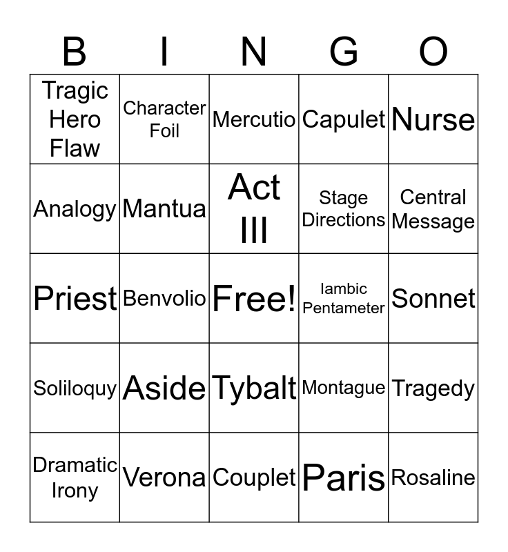 This bingo card has a free space and 24 words: Aside, Verona, Act III, Dramatic Irony, Nurse, Tragic Hero Flaw, Analogy, Character Foil, Iambic Pentameter, Tybalt, Stage Directions, Priest, Montague, Tragedy, Mantua, Paris, Sonnet, Mercutio, Central Message, Benvolio, Rosaline, Soliloquy, Capulet and Couplet.