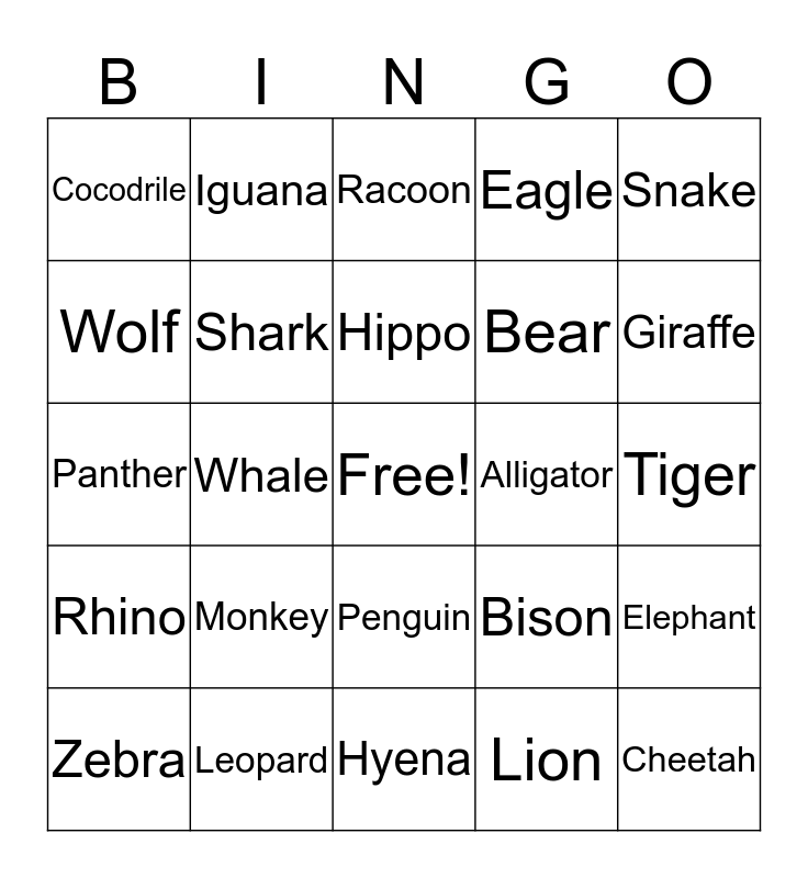 This bingo card has a free space and 24 words: Monkey, Leopard, Hippo, Zebra, Snake, Cocodrile, Wolf, Iguana, Alligator, Penguin, Bear, Panther, Bison, Elephant, Shark, Lion, Tiger, Racoon, Giraffe, Whale, Cheetah, Rhino, Eagle and Hyena.