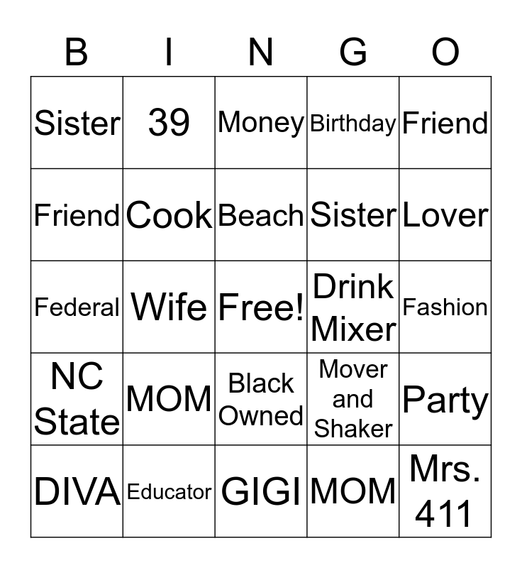 This bingo card has a free space and 29 words: DIVA, Lover, Wife, Organized, Sister, Money, Cook, MOM, Drink Mixer, Educator, Fashion, Mrs. 411, GIGI, MOM, Lover, Auntie, Black Owned, NC State, Friend, Federal, Mover and Shaker, Mrs. 411, Sister, Friend, Birthday, 39, Party, Beach and Bash.