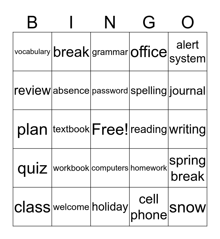 This bingo card has a free space and 29 words: class, attendance, textbook, speaking, vocabulary, grammar, absence, workbook, reading, welcome, writing, snow, holiday, cell phone, journal, closing, computers, quiz, alert system, plan, homework, listening, spelling, review, office, break, spring break, password and email.