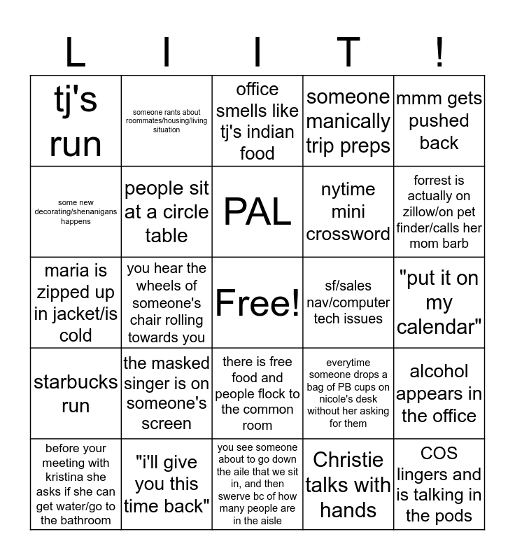 This bingo card has a free space and 29 words: before your meeting with kristina she asks if she can get water/go to the bathroom, nate chuckles at something and then leaves, you hear the wheels of someone's chair rolling towards you, "let's circle back", tj's run, office smells like tj's indian food, people sit at a circle table, the masked singer is on someone's screen, sf/sales nav/computer tech issues, "i'll give you this time back", "put it on my calendar", COS lingers and is talking in the pods, you see someone about to go down the aile that we sit in, and then swerve bc of how many people are in the aisle, Christie talks with hands, forrest is actually on zillow/on pet finder/calls her mom barb, trixie finds snacks or struggles with technology, there is free food and people flock to the common room, starbucks run, mmm gets pushed back, maria is zipped up in jacket/is cold, everytime someone drops a bag of PB cups on nicole's desk without her asking for them, a contact has the same name as you, nytime mini crossword, some new decorating/shenanigans happens, someone manically trip preps, someone rants about roommates/housing/living situation, alcohol appears in the office, PAL and you hear someone trying to explain industry.