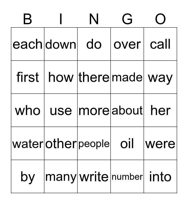 This bingo card has a free space and 29 words: by, word, use, which, each, do, how, other, about, many, her, into, write, number, way, could, people, water, call, who, oil, find, made, first, over, down, were, there and what.