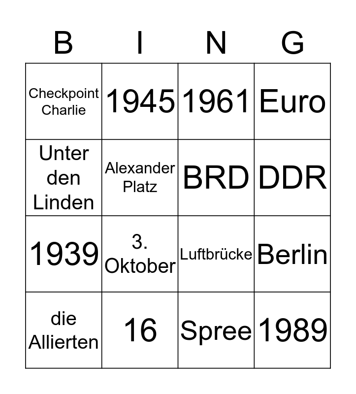 This bingo card has 16 words: 16, Berlin, 1961, Checkpoint Charlie, 1939, 1945, Luftbrücke, Spree, Unter den Linden, Alexander Platz, die Allierten, Euro, 3. Oktober, DDR, BRD and 1989.