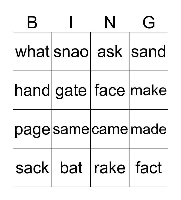 This bingo card has 24 words: mad, glass, make, fast, hand, what, gate, snao, bat, last, page, came, whale, grass, face, name, rake, ask, same, made, sack, fact, sand and bath.
