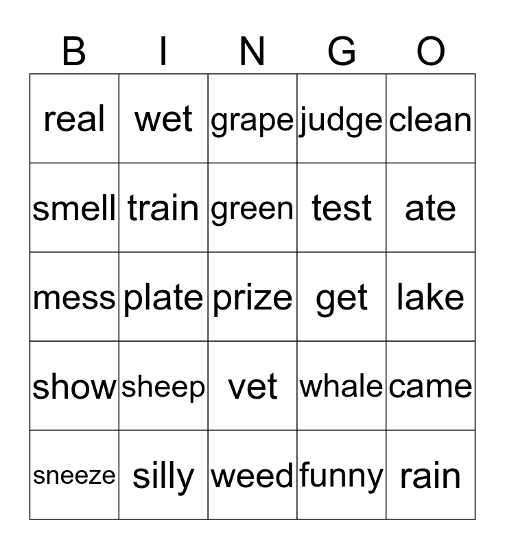 This bingo card has 25 words: sheep, weed, green, sneeze, clean, real, smell, wet, get, vet, test, mess, whale, came, train, rain, lake, grape, ate, plate, prize, silly, show, judge and funny.