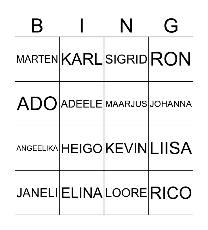 This bingo card has 16 words: ELINA, LIISA, SIGRID, MARTEN, ANGEELIKA, KARL, KEVIN, LOORE, ADO, ADEELE, JANELI, RON, HEIGO, JOHANNA, MAARJUS and RICO.