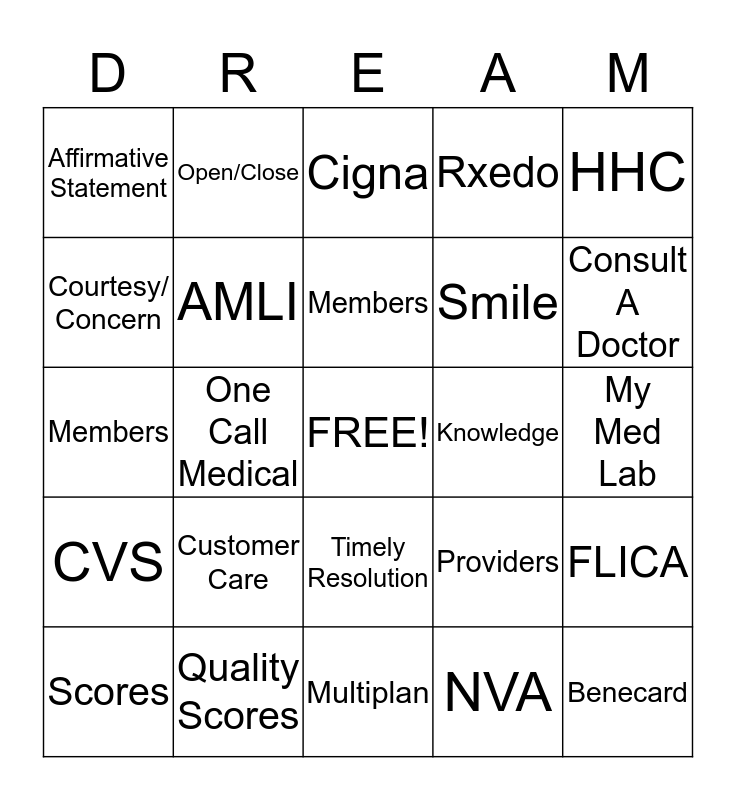 This bingo card has a free space and 24 words: Customer Care, Quality Scores, Members, Scores, HHC, Affirmative Statement, Courtesy/ Concern, Open/Close, Knowledge, Timely Resolution, Smile, Members, Providers, FLICA, AMLI, NVA, My Med Lab, Cigna, Consult A Doctor, One Call Medical, Benecard, CVS, Rxedo and Multiplan.