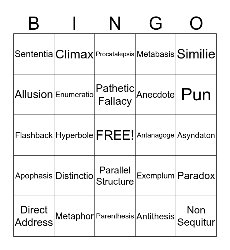 This bingo card has a free space and 24 words: Distinctio, Metaphor, Pathetic Fallacy, Direct Address, Similie, Sententia, Allusion, Climax, Antanagoge, Parallel Structure, Anecdote, Flashback, Exemplum, Paradox, Enumeratio, Antithesis, Asyndaton, Procatalepsis, Pun, Hyperbole, Non Sequitur, Apophasis, Metabasis and Parenthesis.