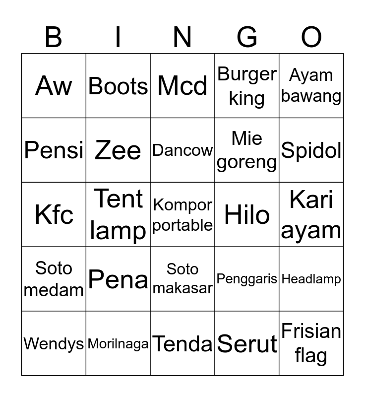 This bingo card has 25 words: Pena, Tenda, Dancow, Wendys, Ayam bawang, Aw, Pensi, Boots, Hilo, Soto makasar, Mie goreng, Kfc, Penggaris, Headlamp, Zee, Frisian flag, Kari ayam, Mcd, Spidol, Tent lamp, Kompor portable, Morilnaga, Soto medam, Burger king and Serut.