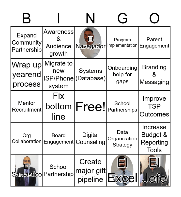 This bingo card has 7 images, a free space and 44 words: La Niña Fresa, El Jefe, El Troyano, El Sarcastico, La Hechicera, El Excel, El Navegador, Alumni Engagement, Parent Engagement, School Partnership, Program Implementation, School Partnerships, Digital Counseling, Board Engagement, Steward long time donors, Create major gift pipeline, Tap into groups that we haven't asked for money, Mentor Recruitment, Mentor Student Engagement, Branding & Messaging, Awareness & Audience growth, Share Impact, Increase fee for service, Expand Community Partnership, Increase student population, Improve TSP Outcomes, Expansion on our Career Programs, Navigating the fallout from Budget cuts, Data Organization Strategy, Org Collaboration, Finalize logic models, Increase Budget & Reporting Tools, Financial Model Analysis, Clean Audit, Fix bottom line, Assessing long term impact, Aligning strategic direction, Program Improvement, Systems (Database), Wrap up yearend process, Onboarding help for gaps, (Start) phase out of database work, Migrate to new ISP/Phone system and Stabilize our server/backup plan.