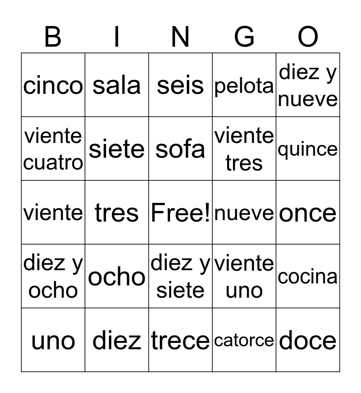 This bingo card has a free space and 29 words: uno, dos, tres, cuatro, cinco, seis, siete, ocho, nueve, diez, once, doce, trece, catorce, quince, diez y seis, diez y siete, diez y ocho, diez y nueve, viente, viente uno, viente dos, viente tres, viente cuatro, pelota, sala, cocina, sofa and mano.