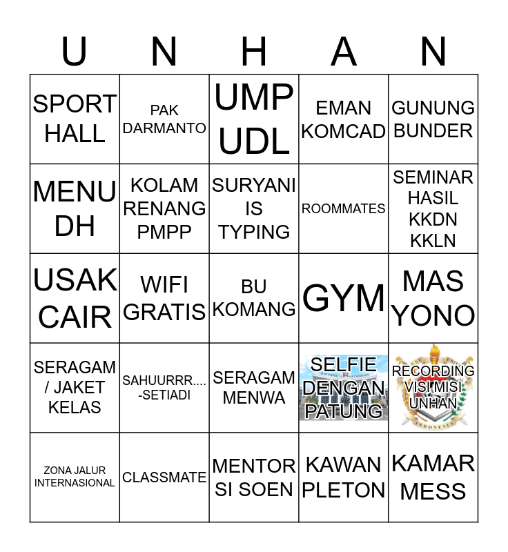 This bingo card has 5 images and 35 words: SERAGAM PDL, UPACARA, MAS DRAJAT, ROOMMATES, KAMAR MESS, SPORT HALL, KOLAM RENANG PMPP, STAND BY FORCE, GYM, CHANTI DHARMA PARK, USAK CAIR, PAK DARMANTO, SERAGAM MENWA, TANGGA UNHAN, GUNUNG BUNDER, SERAGAM / JAKET KELAS, CLASSMATE, UMP UDL, KAWAN PLETON, MAS YONO, ZONA JALUR INTERNASIONAL, WIFI GRATIS, BU KOMANG, APEL PAGI, SEMINAR HASIL KKDN KKLN, MENU DH, PERPUSTAKAAN, MENTOR SI SOEN, SELFIE DENGAN PATUNG, RECORDING VISI MISI UNHAN, MATI LAMPU/ MATI AIR/ MATI WIFI, SAHUURRR.... -SETIADI, SURYANI IS TYPING, EMAN KOMCAD and KOPERASI/ INDOMARET.