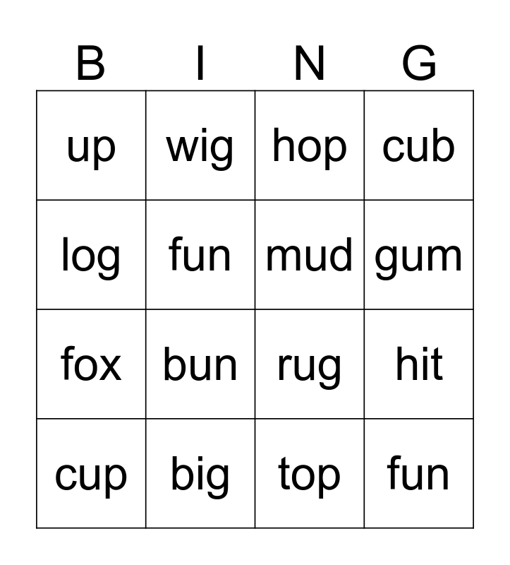 This bingo card has 24 words: win, tub, gum, cut, log, up, fun, wig, big, pin, fox, rug, mix, fin, mud, pit, top, hop, bun, hit, cup, fun, cub and bin.
