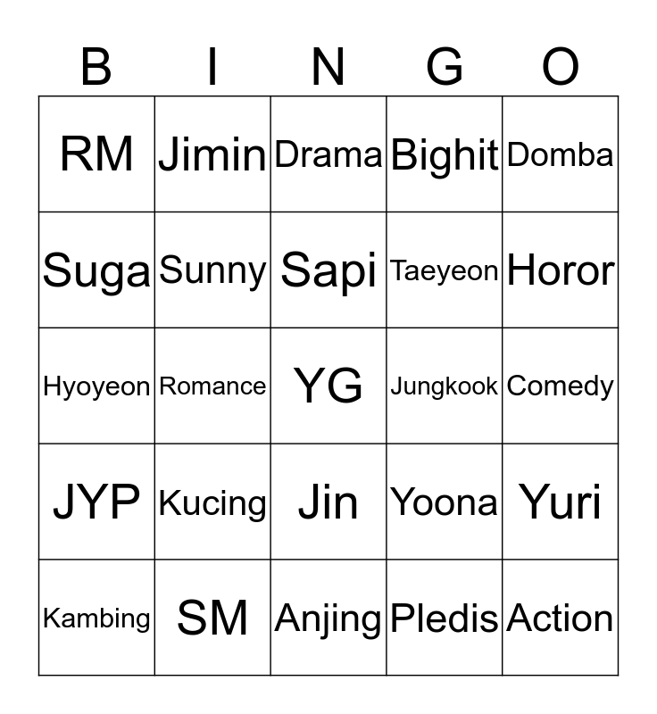This bingo card has 25 words: Kucing, Anjing, Sapi, Kambing, Domba, RM, Suga, Jimin, Jungkook, Jin, Taeyeon, Hyoyeon, Yoona, Yuri, Sunny, Action, Comedy, Drama, Horor, Romance, YG, SM, JYP, Bighit and Pledis.