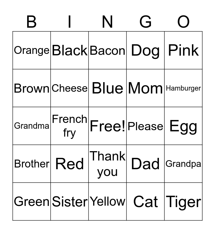 This bingo card has a free space and 25 words: Red, Yellow, Blue, Green, Pink, Orange, Brown, Black, Please, Thank you, Mom, Grandma, Dad, Grandpa, Cheese, Cracker, Egg, Bacon, Hamburger, French fry, Tiger, Sister, Brother, Dog and Cat.