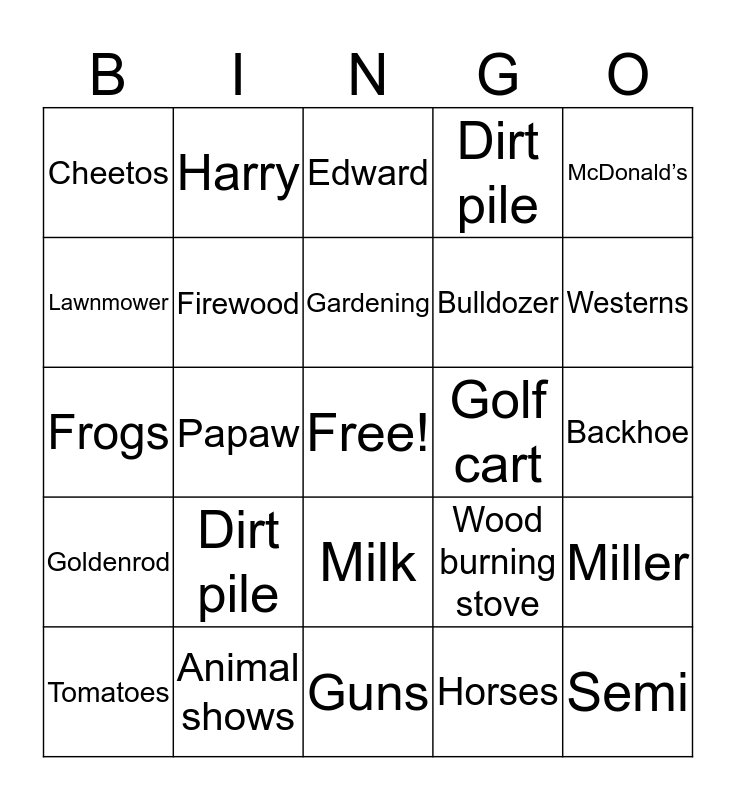 This bingo card has a free space and 29 words: Tomatoes, Coal mines, Papaw, Newspaper, Cheetos, Edward, Firewood, Dirt pile, Golf cart, Animal shows, Backhoe, Semi, Guns, Horses, Westerns, Orange juice, Milk, Goldenrod, McDonald’s, Frogs, Wood burning stove, January, Bulldozer, Lawnmower, Dirt pile, Harry, Miller, Gardening and Tractor.