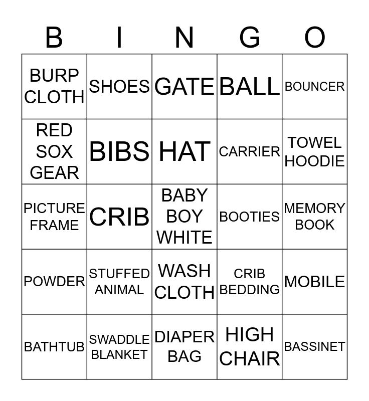 This bingo card has a free space and 55 words: MIRROR, BATHTUB, BOTTLE, BURP CLOTH, DIAPER BAG, MONITOR, BIBS, BOTTLE WARMER, CARRIER, DIAPER CAKE, BALL, BINKIE, CHANGING PAD, DIAPER CREAM, BASEBALL HAT, BLANKET, BOUNCER, CRIB, DIAPER PAIL, BASSINET, BOOTIES, BREAST PUMP, CRIB BEDDING, GATE, GIFT CARD, HAT, HIGH CHAIR, JOLLY JUMPER, MEMORY BOOK, MOBILE, NURSING PILLOW, ONESIE, PARENTING BOOK, PATRIOTS GEAR, RED SOX GEAR, PICTURE FRAME, PLAY PEN, POWDER, QUILT, RATTLE, SHOES, SIPPIE CUP, SLEEPERS, SPOON, STUFFED ANIMAL, SWADDLE BLANKET, SWING, TEETHING RING, THERMOMETER, TOWEL HOODIE, TOYS, TRAVEL TOYS, WAGON, WASH CLOTH and WIPES.