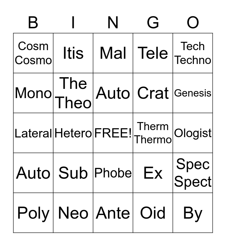 This bingo card has a free space and 24 words: Sub, Neo, Auto, Poly, Tech Techno, Cosm Cosmo, Mono, Itis, Therm Thermo, Phobe, Crat, Lateral, Ex, Spec Spect, The Theo, Oid, Ologist, Mal, Genesis, Hetero, By, Auto, Tele and Ante.