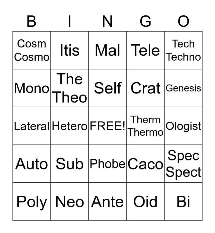 This bingo card has a free space and 24 words: Sub, Neo, Self, Poly, Tech Techno, Cosm Cosmo, Mono, Itis, Therm Thermo, Phobe, Crat, Lateral, Caco, Spec Spect, The Theo, Oid, Ologist, Mal, Genesis, Hetero, Bi, Auto, Tele and Ante.