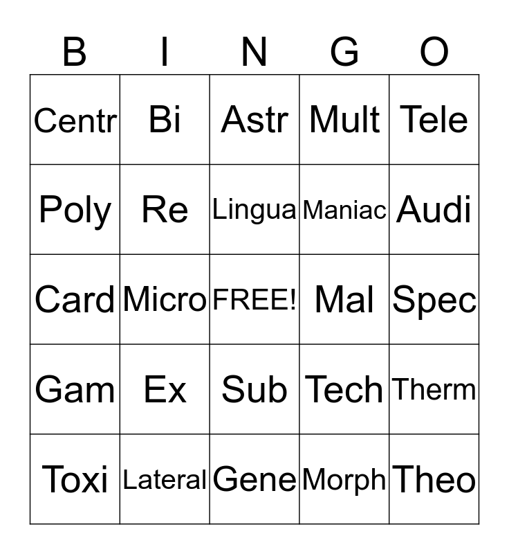 This bingo card has a free space and 24 words: Ex, Lateral, Lingua, Toxi, Tele, Centr, Poly, Bi, Mal, Sub, Maniac, Card, Tech, Therm, Re, Morph, Spec, Astr, Audi, Micro, Theo, Gam, Mult and Gene.