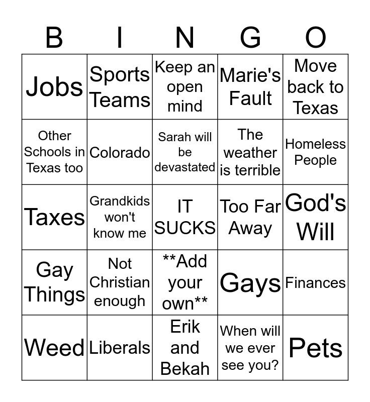 This bingo card has a free space and 24 words: Weed, Not Christian enough, Sarah will be devastated, When will we ever see you?, Move back to Texas, Jobs, Sports Teams, Keep an open mind, Too Far Away, God's Will, Taxes, Colorado, Gays, Finances, Other Schools in Texas too, Liberals, Erik and Bekah, Marie's Fault, Homeless People, Gay Things, Grandkids won't know me, **Add your own**, The weather is terrible and Pets.