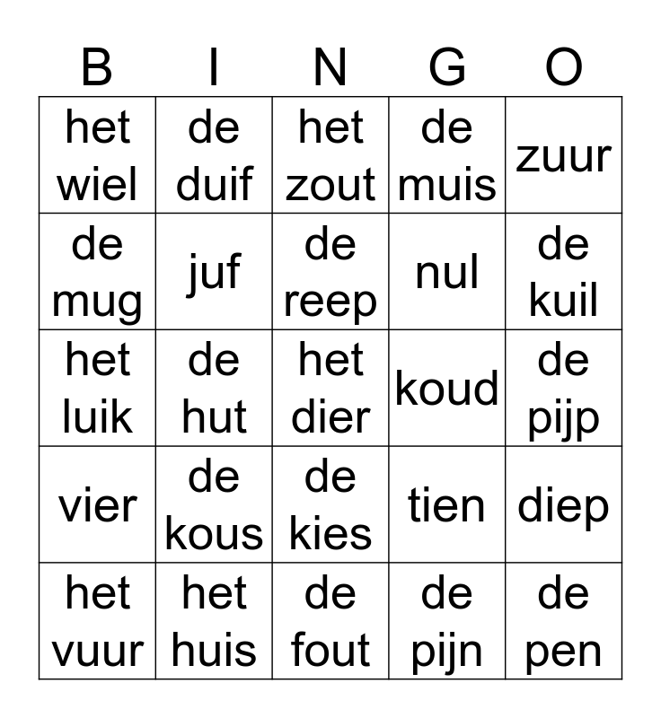 This bingo card has 45 words: het hout, het dier, de kaas, het vuur, de wieg, de pijn, het zout, de wijn, zuur, het huis, de muis, koud, de kies, de kous, het touw, de fout, de vrouw, het luik, de tuin, de kuil, de duif, de bijl, de riem, het wiel, vijf, de pijp, het ijs, de dij, tien, vier, het riet, diep, wijs, de lijn, de kus, de hut, het been, de teen, de pen, de reep, de mug, nul, huur, juf and suf.