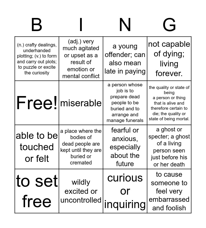 This bingo card has 16 words: wildly excited or uncontrolled, a ghost or specter; a ghost of a living person seen just before his or her death, a young offender; can also mean late in paying, (n.) crafty dealings, underhanded plotting; (v.) to form and carry out plots; to puzzle or excite the curiosity, able to be touched or felt, (adj.) very much agitated or upset as a result of emotion or mental conflict, fearful or anxious, especially about the future, curious or inquiring, Free!, miserable, to set free, not capable of dying; living forever., a place where the bodies of dead people are kept until they are buried or cremated, the quality or state of being a person or thing that is alive and therefore certain to die; the quality or state of being mortal., a person whose job is to prepare dead people to be buried and to arrange and manage funerals and to cause someone to feel very embarrassed and foolish.