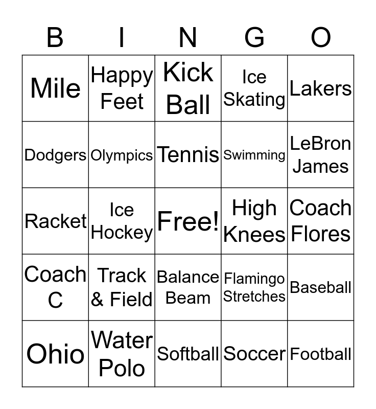 This bingo card has a free space and 52 words: Push Up, Football, Jumping Jack, Softball, Track & Field, Dodge Ball, Happy Feet, Gymnastics, Dodgers, Trunk Lift, Olympics, Rams, Baseball, Flamingo Stretches, Carnival of Champions, Super Bowl, Tennis, High Knees, Curl Ups, Lakers, Ice Hockey, Soccer, Mile, Swimming, Tetherball, Handball, Four Square, Volleyball, LeBron James, Ping Pong, Frisbee, Ice Skating, Snow-boarding, Skiing, Hop Scotch, Kick Ball, Water Polo, Coach, Finish Line, Coach Juan, Coach Dez, Coach Flores, Coach C, Coach Johnson, Balance Beam, 3 Outs, Diving Board, Racket, Slam Dunk, Bat, Ohio and Hurdle.
