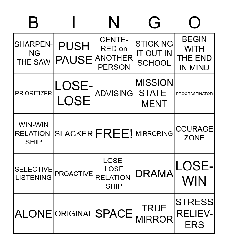 This bingo card has a free space and 24 words: PROACTIVE, ORIGINAL, ADVISING, ALONE, BEGIN WITH THE END IN MIND, SHARPEN-ING THE SAW, PRIORITIZER, PUSH PAUSE, MIRRORING, LOSE-LOSE RELATION-SHIP, MISSION STATE- MENT, WIN-WIN RELATION-SHIP, DRAMA, LOSE-WIN, LOSE- LOSE, TRUE MIRROR, COURAGE ZONE, CENTE- RED on ANOTHER PERSON, PROCRASTINATOR, SLACKER, STRESS RELIEV- ERS, SELECTIVE LISTENING, STICKING IT OUT IN SCHOOL and SPACE.