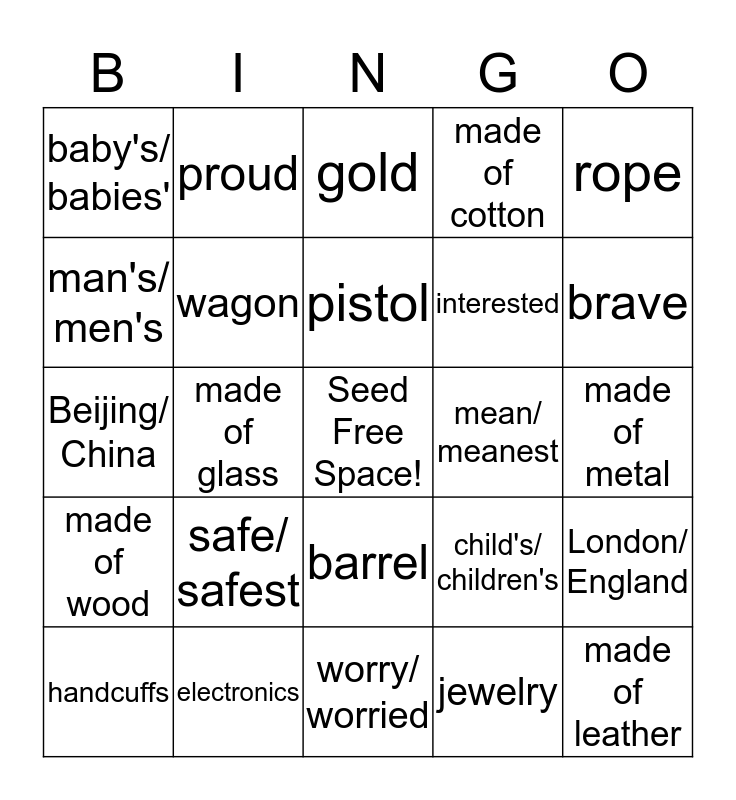 This bingo card has a free space and 39 words: jail, sheriff, robbers, wagon, handcuffs, barrel, pistol, saddle, rope, made of wood, made of glass, made of cotton, made of leather, made of metal, mean/ meanest, safe/ safest, bubble, baby's/ babies', sheriff's/ sheriffs', child's/ children's, man's/ men's, worry/ worried, interested, brave, brothers/ brothers', Europeans, American Indians/ First Nations, tribe, reservations, proud, history, traditions, gold, electronics, jewelry, Istanbul/ Turkey, London/ England, Beijing/ China and Cairo/ Egypt.
