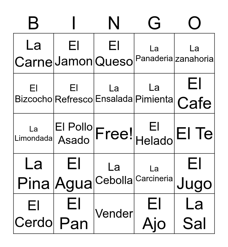 This bingo card has a free space and 24 words: El Cerdo, El Agua, La Ensalada, El Ajo, La zanahoria, La Carne, El Jamon, El Queso, El Helado, El Te, La Limondada, El Refresco, La Carcineria, El Jugo, El Bizcocho, El Pan, Vender, La Panaderia, El Cafe, La Pina, El Pollo Asado, La Cebolla, La Pimienta and La Sal.