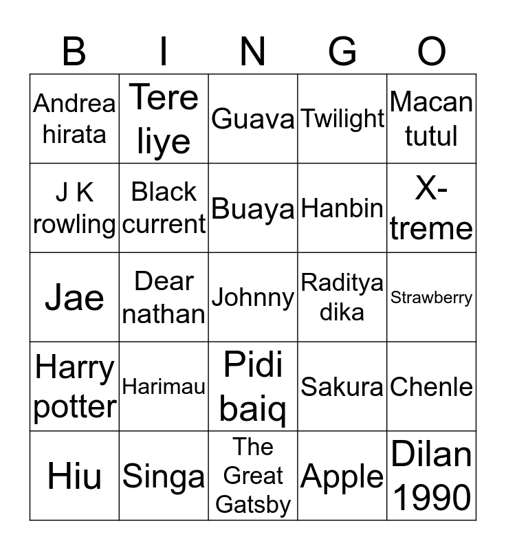 This bingo card has a free space and 24 words: Harimau, Singa, Buaya, Hiu, Macan tutul, Andrea hirata, J K rowling, Tere liye, Raditya dika, Pidi baiq, Hanbin, Jae, Sakura, Chenle, Black current, Apple, Strawberry, Guava, X-treme, Dear nathan, Dilan 1990, Harry potter, Twilight and The Great Gatsby.