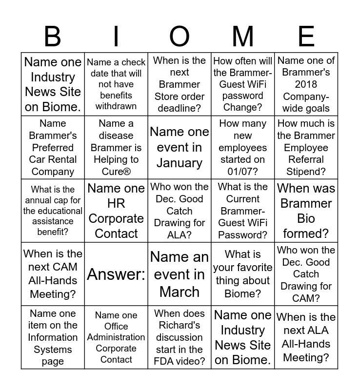 This bingo card has 25 words: Answer:, When does Richard's discussion start in the FDA video?, Name one event in January, Name one item on the Information Systems page, Name one of Brammer's 2018 Company-wide goals, Name one Industry News Site on Biome., Name Brammer's Preferred Car Rental Company, Name a check date that will not have benefits withdrawn, What is the Current Brammer-Guest WiFi Password?, Name an event in March, How many new employees started on 01/07?, What is the annual cap for the educational assistance benefit?, What is your favorite thing about Biome?, Who won the Dec. Good Catch Drawing for CAM?, Name a disease Brammer is Helping to Cure®, When is the next ALA All-Hands Meeting?, When was Brammer Bio formed?, When is the next Brammer Store order deadline?, How much is the Brammer Employee Referral Stipend?, Name one HR Corporate Contact, Who won the Dec. Good Catch Drawing for ALA?, Name one Office Administration Corporate Contact, When is the next CAM All-Hands Meeting?, How often will the Brammer-Guest WiFi password Change? and Name one Industry News Site on Biome..