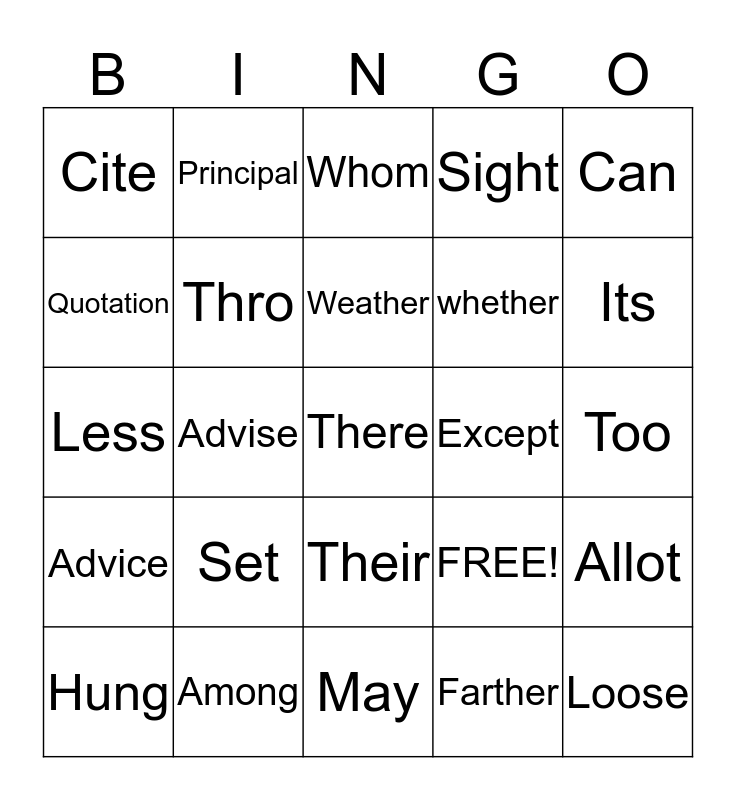 This bingo card has 25 words: Set, May, Weather, Hung, Can, Cite, Quotation, Principal, Except, Their, whether, Less, FREE!, Allot, Thro, Loose, Too, Whom, Its, Advise, There, Among, Advice, Sight and Farther.