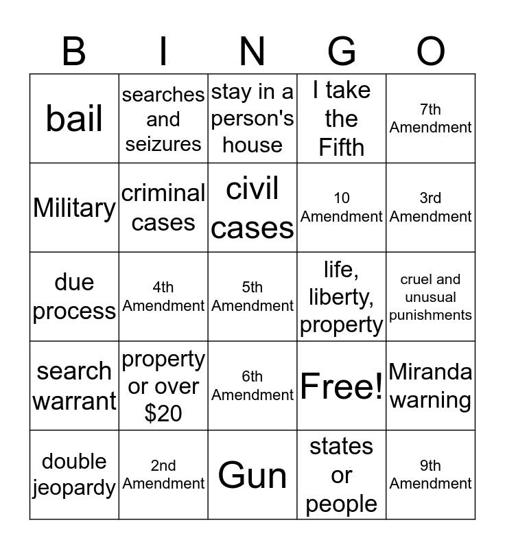 This bingo card has 27 words: Free!, 9th Amendment, 10 Amendment, Gun, Military, stay in a person's house, searches and seizures, search warrant, life, liberty, property, Miranda warning, due process, I take the Fifth, double jeopardy, 2nd Amendment, 3rd Amendment, eminent domain, criminal cases, civil cases, property or over $20, bail, cruel and unusual punishments, states or people, 4th Amendment, 5th Amendment, 6th Amendment, 7th Amendment and 8th Amendment.