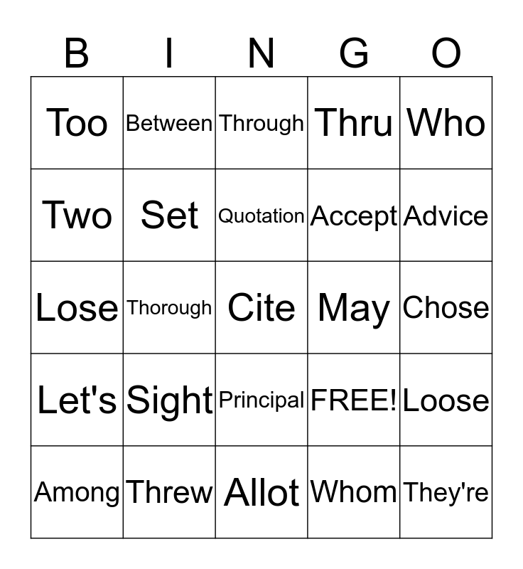 This bingo card has 25 words: Sight, Allot, Quotation, Among, Who, Too, Two, Between, May, Principal, Accept, Lose, FREE!, Loose, Set, They're, Chose, Through, Advice, Thorough, Cite, Threw, Let's, Thru and Whom.