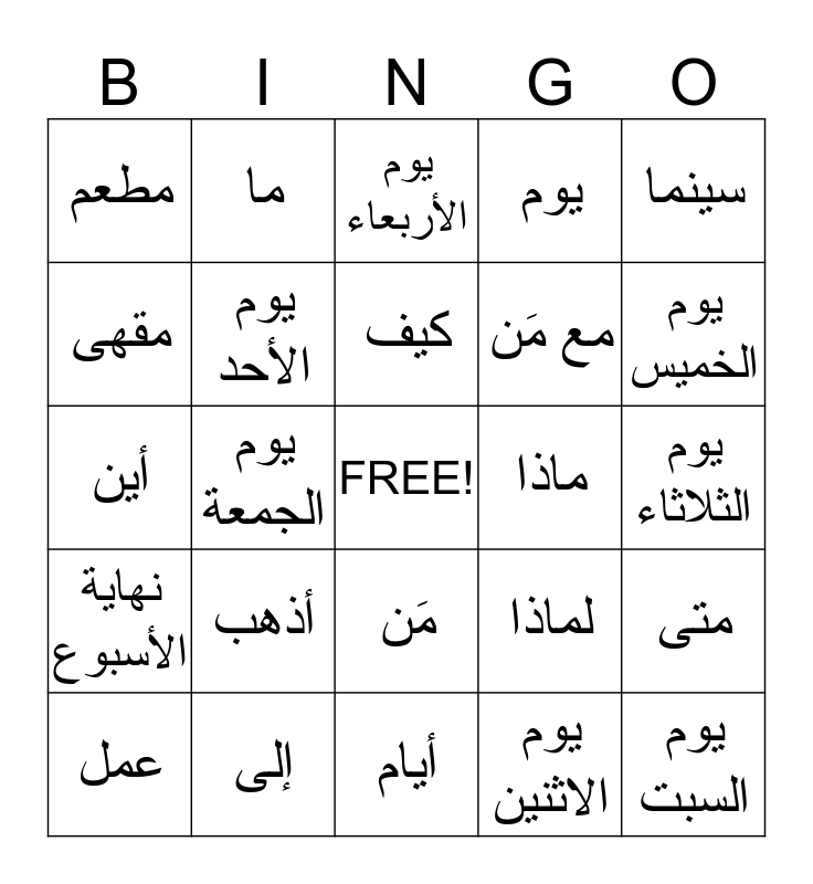 This bingo card has a free space and 24 words: أذهب, إلى, كيف, عمل, سينما, مطعم, مقهى, ما, ماذا, مَن, مع مَن, أين, لماذا, متى, يوم الأحد, يوم الاثنين, يوم الثلاثاء, يوم الأربعاء, يوم الخميس, يوم الجمعة, يوم السبت, نهاية الأسبوع, يوم and أيام.