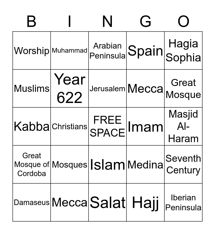 This bingo card has a free space and 24 words: Mosques, Mecca, Jerusalem, Damaseus, Hagia Sophia, Worship, Muslims, Muhammad, Imam, Islam, Mecca, Kabba, Medina, Seventh Century, Year 622, Hajj, Masjid Al-Haram, Arabian Peninsula, Great Mosque, Christians, Iberian Peninsula, Great Mosque of Cordoba, Spain and Salat.