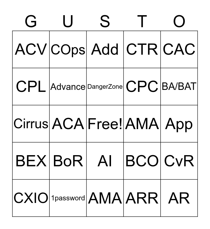 This bingo card has a free space and 30 words: 1password, 425 2nd Street, ACA, ACH, ACV, Add, Advance, AI, AMA, AMA, App, AR, ARR, AWS, BA/BAT, BambooHR, BCO, BEX, BoR, CAC, Cirrus, Color, COps, CPC, CPL, CTR, CvR, CXIO, DangerZone and DIY.