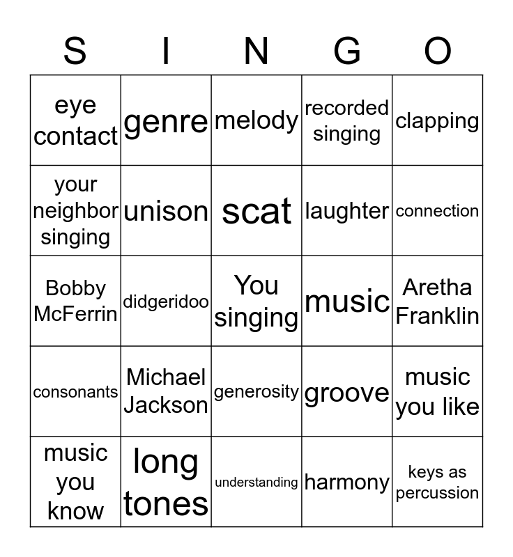 This bingo card has a free space and 60 words: breath, long tones, vowel sounds, consonants, harmony, rhythm, unison, singing, laughter, song, recorded singing, Ben singing, your neighbor singing, microphone, speaker, eye contact, keys as percussion, clapping, words, scat, music, melody, music you know, music you like, learning, leading, teaching, chatting, connection, fun, solo, instruments, beatbox, rhyme, genre, lyrics, looping, didgeridoo, harmonica, Bobby McFerrin, Rhiannon, Michael Jackson, Aretha Franklin, Chanticleer, groove, poetry, honesty, vulnerability, kindess, generosity, understanding, courage, imagination, emotion, images, color, tone, game, surprise and questions.