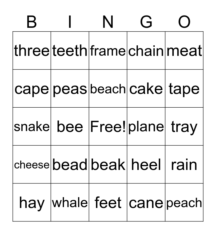 This bingo card has a free space and 24 words: bead, whale, beach, hay, meat, three, cape, teeth, plane, beak, cake, snake, heel, rain, peas, cane, tray, frame, tape, bee, peach, cheese, chain and feet.