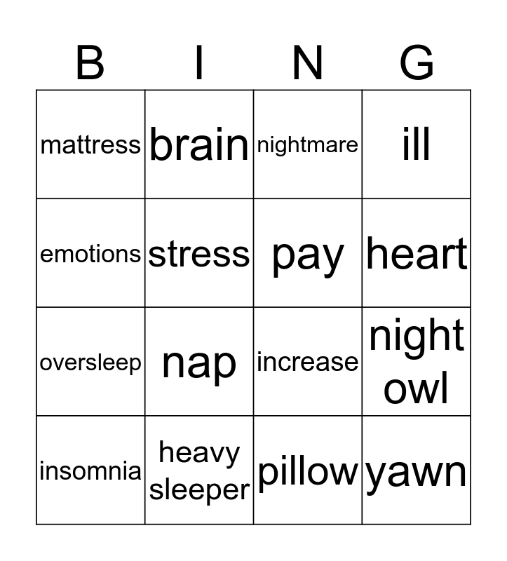 This bingo card has 16 words: heavy sleeper, night owl, nightmare, mattress, oversleep, brain, increase, pillow, emotions, stress, insomnia, ill, nap, heart, pay and yawn.
