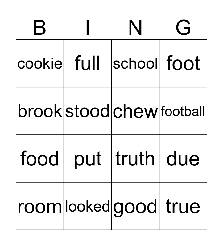 This bingo card has 16 words: looked, due, school, cookie, food, full, truth, good, brook, stood, room, foot, put, football, chew and true.